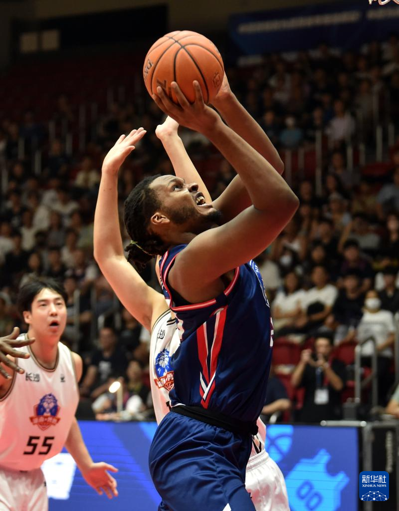 9月1日,香港金牛队球员朱松玮(中)在比赛中投篮。