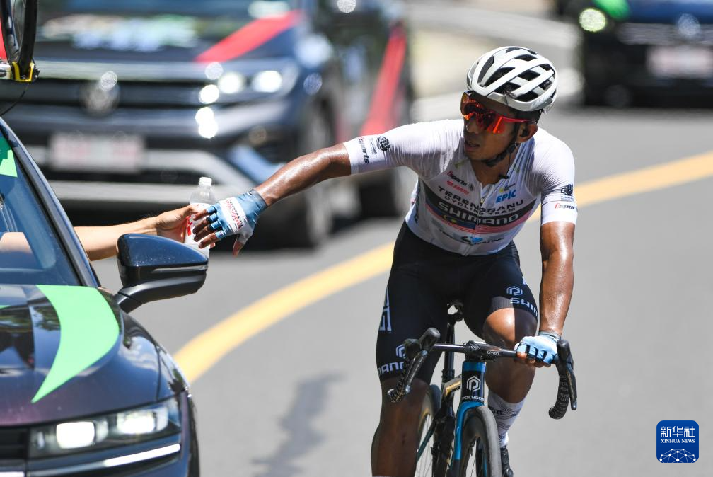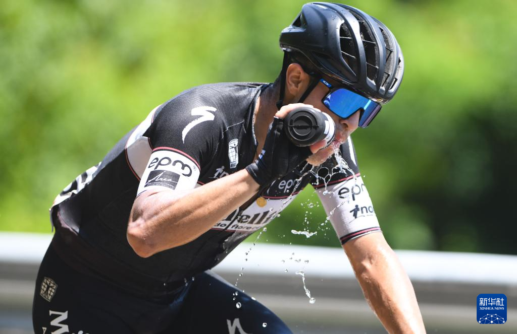 8月31日,哥伦比亚麦德林车队车手奥坎波在比赛中补水。