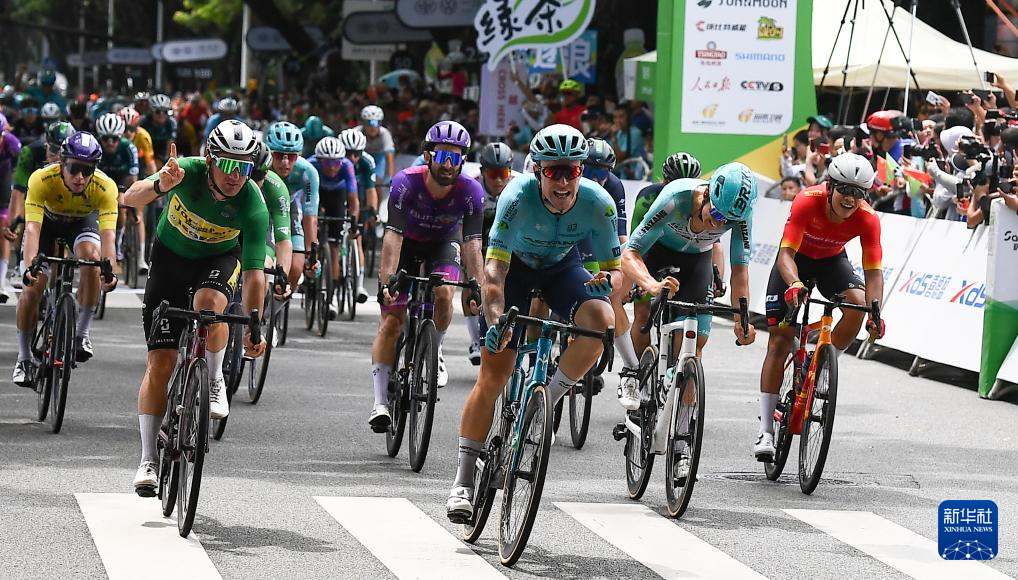 8月31日,哈萨克斯坦阿斯塔纳车队车手斯米尔诺夫(前中)率先冲线后庆祝。