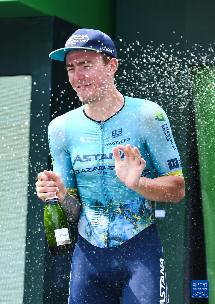 8月31日,哈萨克斯坦阿斯塔纳车队车手斯米尔诺夫在领奖台上庆祝,他获得了第五赛段的冠军。