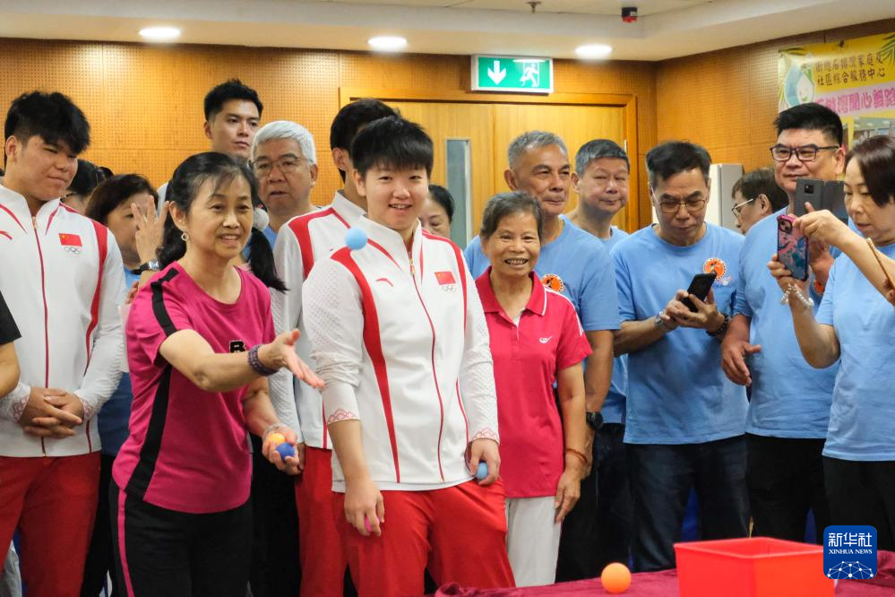 9月2日,在澳门妇联乐满家庭服务中心,游泳运动员张雨霏(前右)与市民交流。新华社记者 张金加 摄
