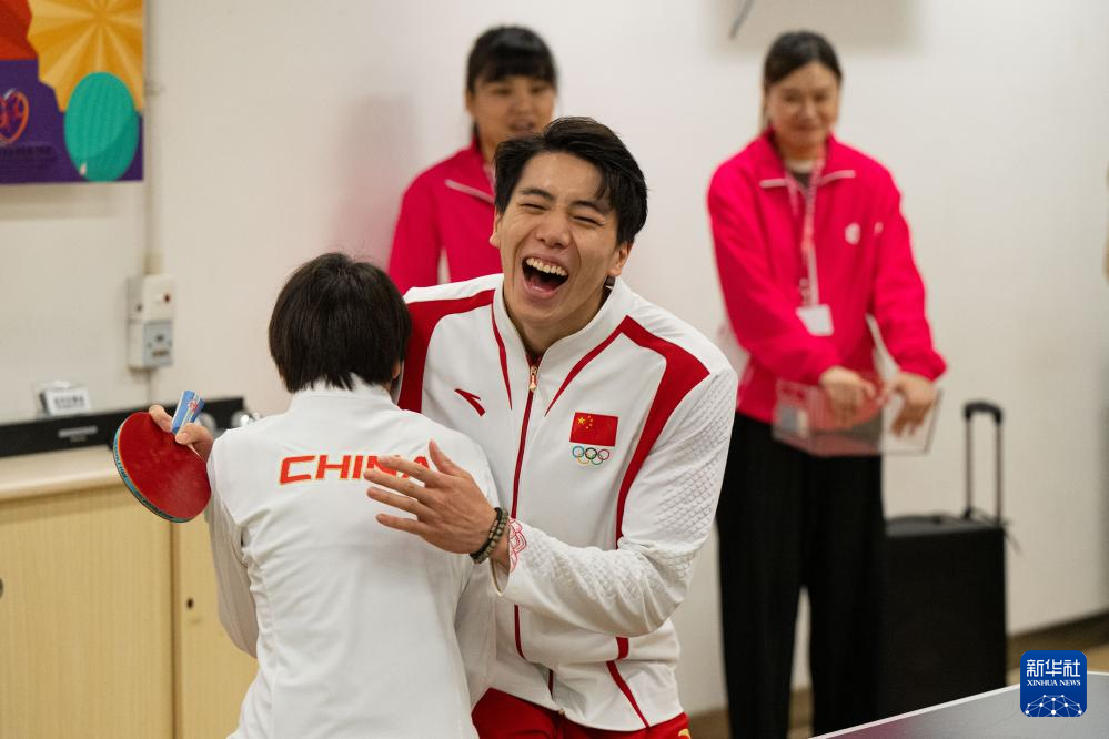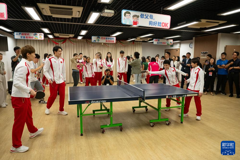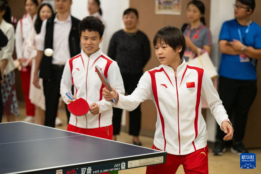 9月2日,在澳门妇联乐满家庭服务中心,跳水运动员全红婵(右)与举重运动员侯志慧在乒乓球互动活动中。新华社记者 张金加 摄