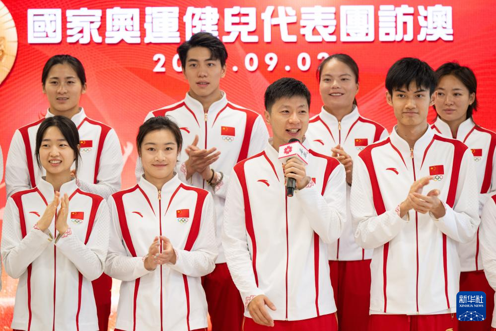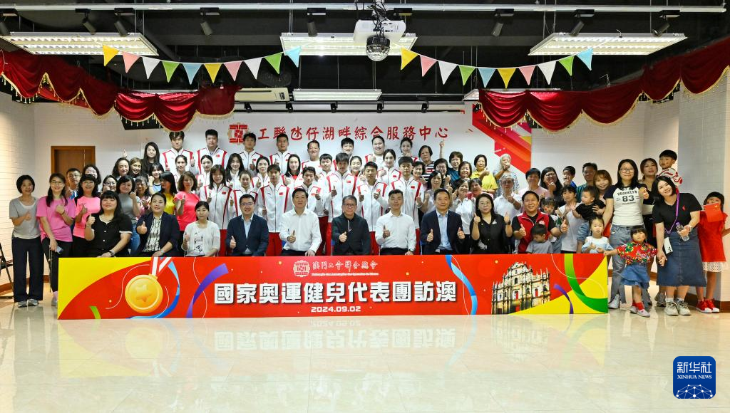 9月2日,内地奥运健儿代表团与澳门工联氹仔湖畔综合服务中心人员合影。新华社发
