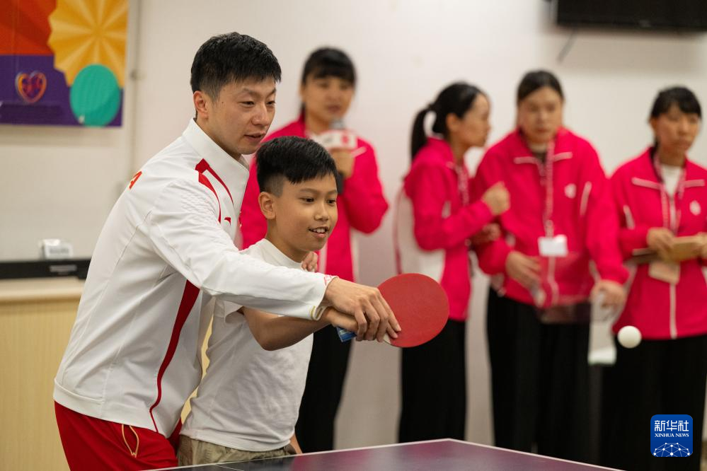 9月2日,在澳门妇联乐满家庭服务中心,乒乓球运动员马龙(左)与小朋友在乒乓球互动活动中。新华社记者 张金加 摄
