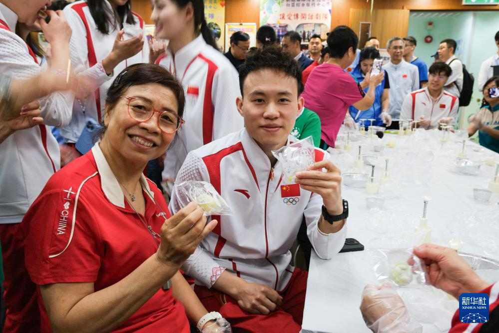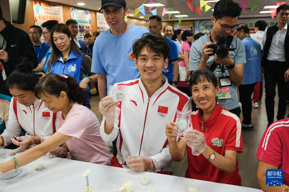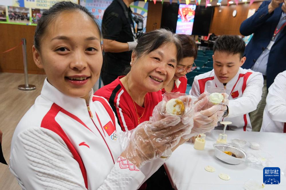 9月2日,在街总石排湾家庭及社区综合服务中心,跳水运动员谢思埸(右)展示与社区居民一起制作的冰皮月饼。新华社记者 郭雨祺 摄