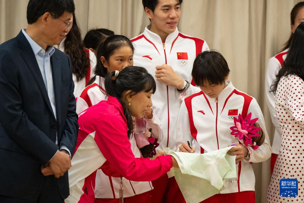 9月2日,在澳门妇联乐满家庭服务中心,跳水运动员全红婵(右一)为市民签名。新华社记者 张金加 摄