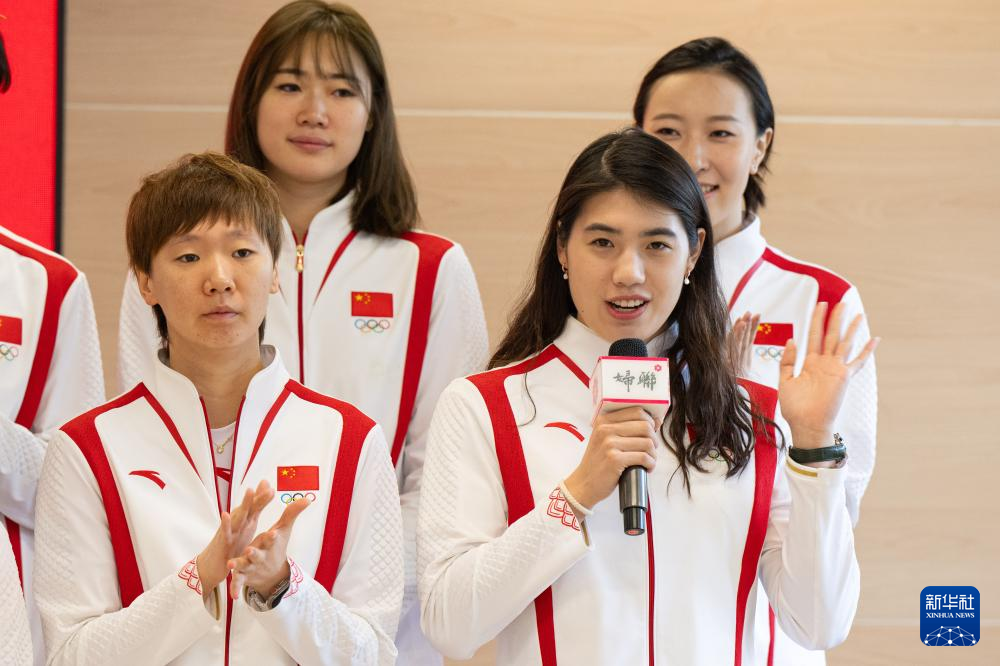 9月2日,在澳门妇联乐满家庭服务中心,乒乓球运动员王曼昱、游泳运动员孙佳俊、举重运动员侯志慧与跳水运动员全红婵(从左至右)在乒乓球互动活动中。新华社记者 张金加 摄