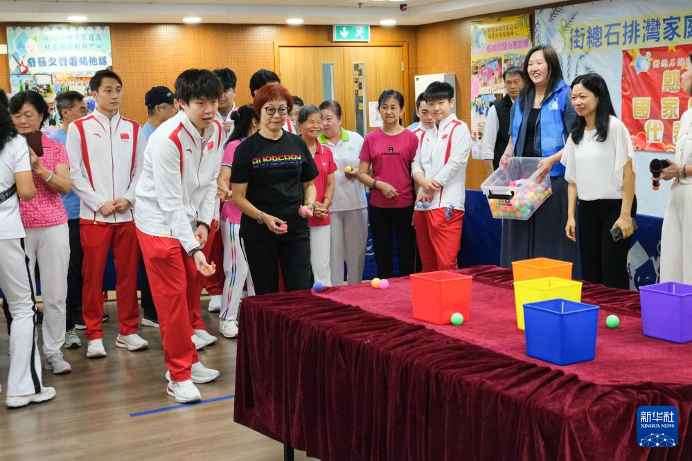 9月2日,在街总石排湾家庭及社区综合服务中心,跳水运动员练俊杰(中)与社区居民在“弹球入篮”游戏中。新华社记者 郭雨祺 摄
