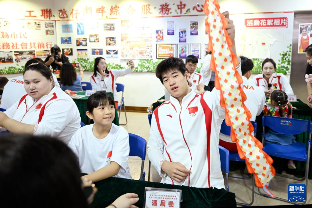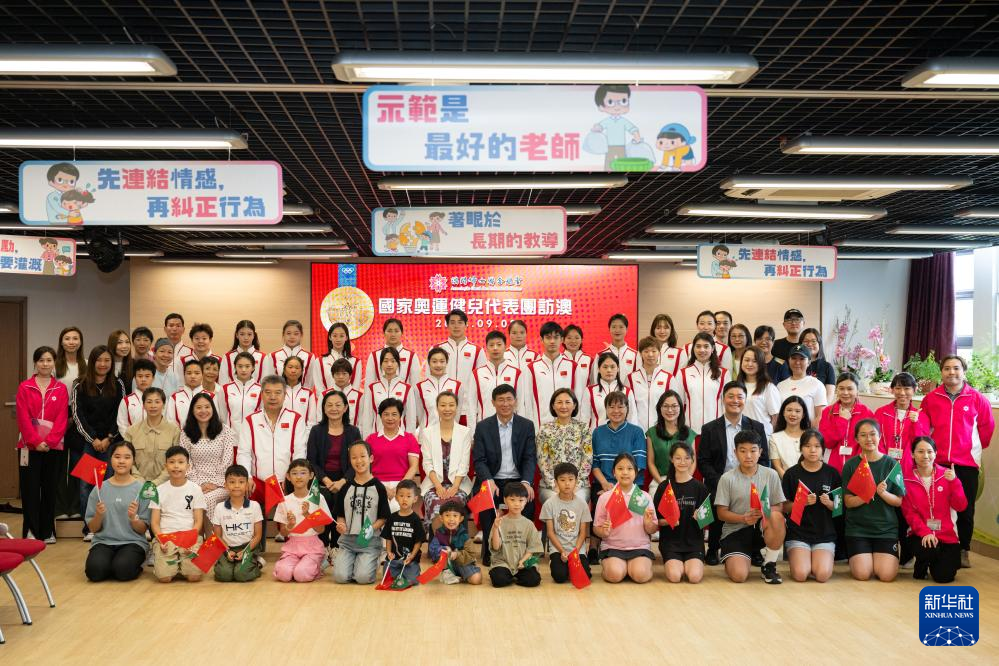 9月2日,内地奥运健儿代表团与街总石排湾家庭及社区综合服务中心工作人员合影。新华社记者 郭雨祺 摄