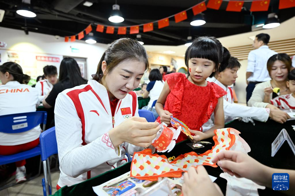 9月2日,在澳门工联氹仔湖畔综合服务中心,乒乓球运动员陈梦(左一)与小朋友一起制作灯笼。新华社发