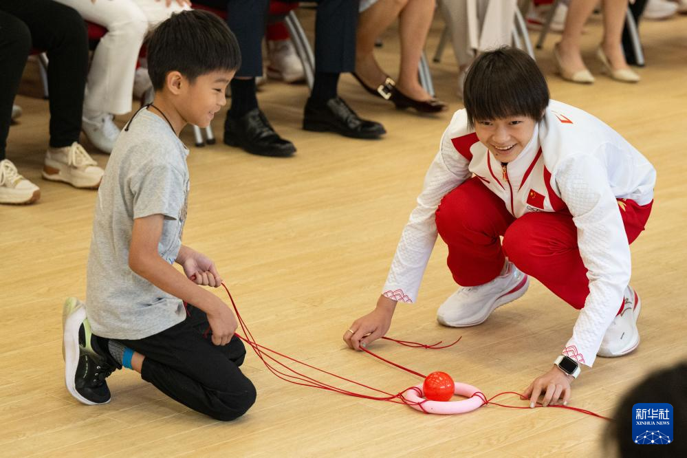 9月2日,在澳门妇联乐满家庭服务中心,跳水运动员全红婵(右)与小朋友游戏互动。新华社记者 张金加 摄
