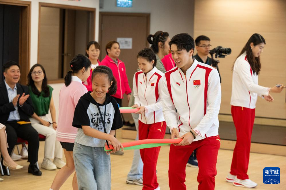 9月2日,在澳门妇联乐满家庭服务中心,游泳运动员孙佳俊(前右)与小朋友游戏互动。新华社记者 张金加 摄