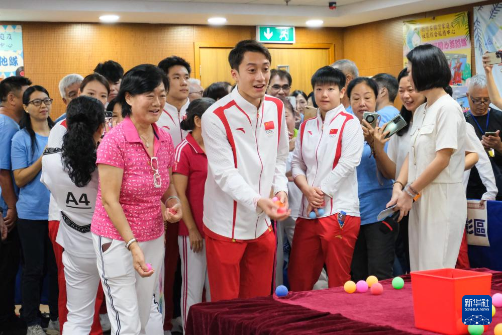 9月2日,在澳门妇联乐满家庭服务中心,乒乓球运动员马龙(前右二)与市民交流。新华社记者 张金加 摄