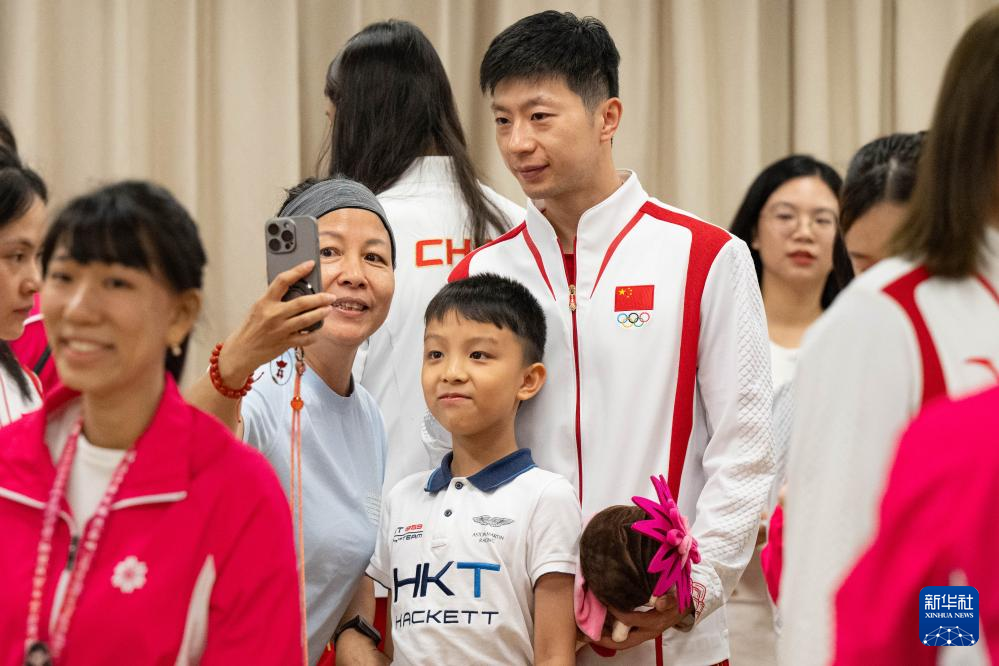 9月2日,在澳门妇联乐满家庭服务中心,乒乓球运动员马龙与市民合影。新华社记者 张金加 摄