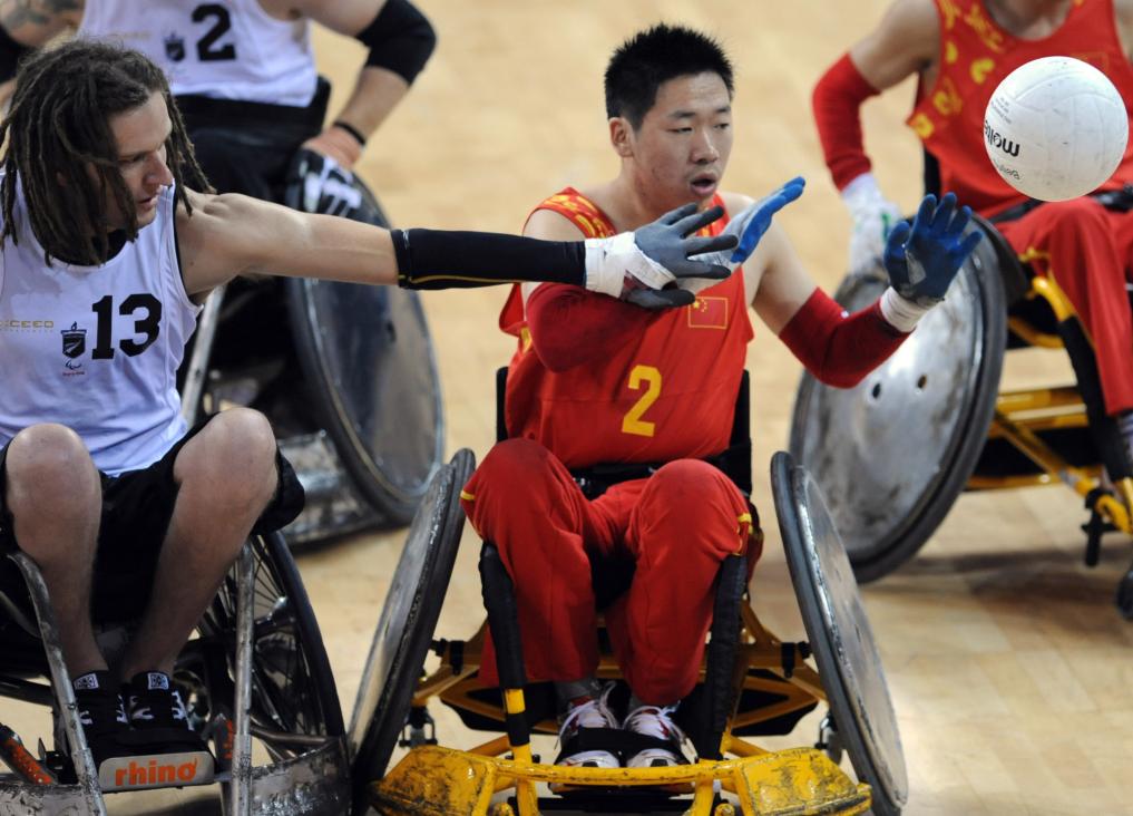 2008年9月15日,中国队球员韩贵飞(右)在北京2008年残奥会轮椅橄榄球5至8名排位赛中与对手抢球。新华社记者 王晔彪 摄