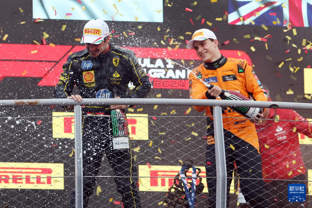 9月1日,冠军法拉利车队摩纳哥车手勒克莱尔(左)和亚军迈凯伦车队澳大利亚车手皮亚斯特里在颁奖仪式上喷洒香槟庆祝。新华社记者 赵丁喆 摄