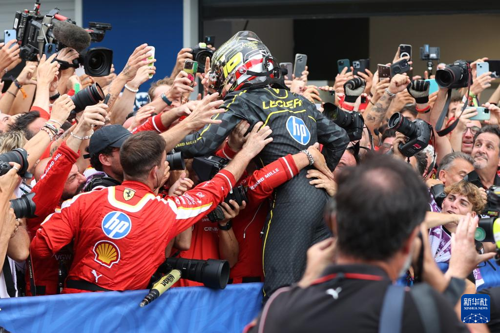 9月1日,法拉利车队摩纳哥车手勒克莱尔在夺冠后庆祝。新华社记者 赵丁喆 摄