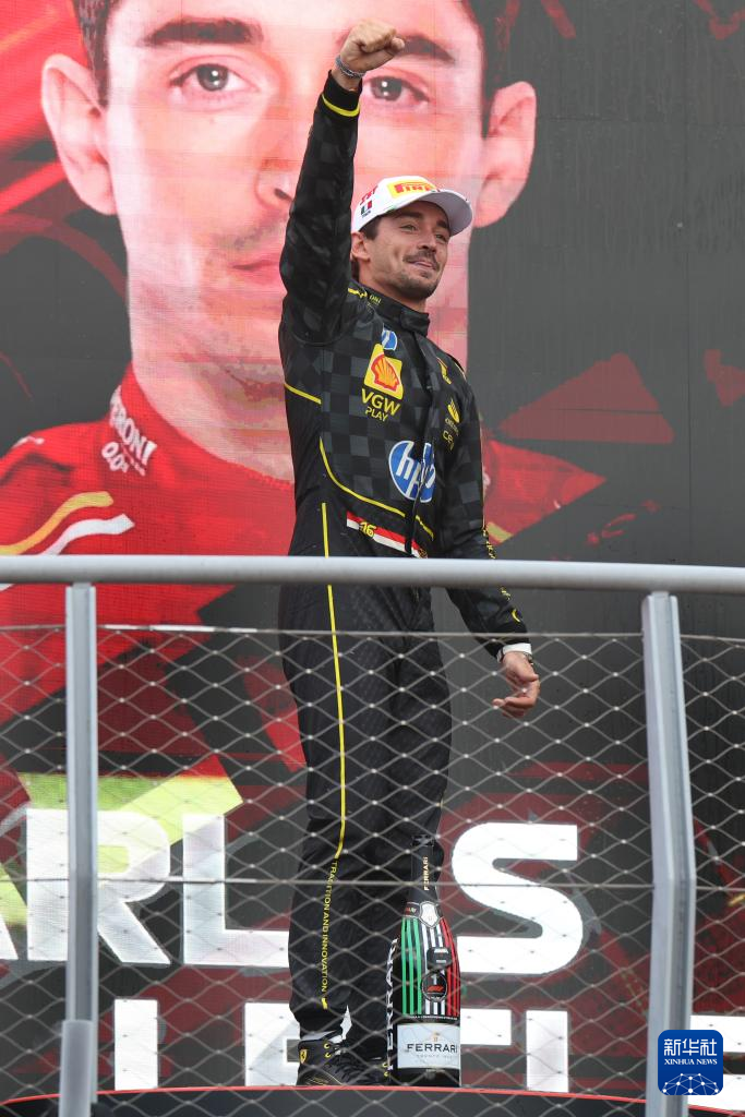 9月1日,冠军法拉利车队摩纳哥车手勒克莱尔在颁奖仪式上庆祝。新华社记者 赵丁喆 摄