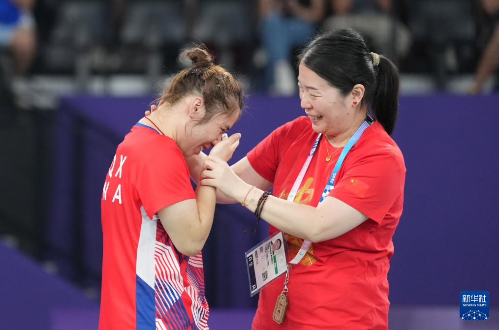 9月2日,教练张先明(右)在比赛后安慰喜极而泣的杨秋霞。新华社记者 贺灿铃 摄