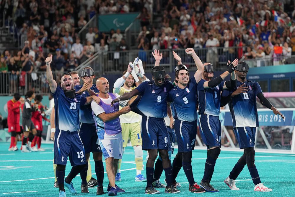 9月1日,法国队成员在获胜后庆祝。当日,在巴黎残奥会盲人足球A组小组赛中,中国队0比1不敌法国队。新华社记者 熊琦 摄