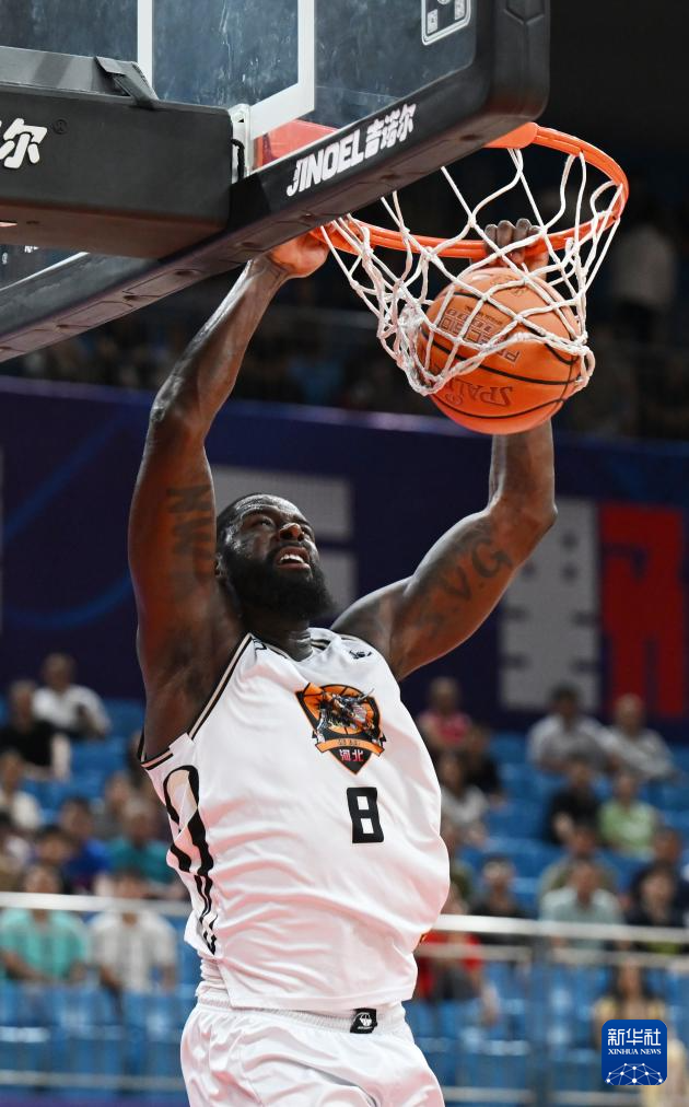 9月2日,石家庄翔蓝队球员詹姆斯·恩尼斯在比赛中扣篮得分。