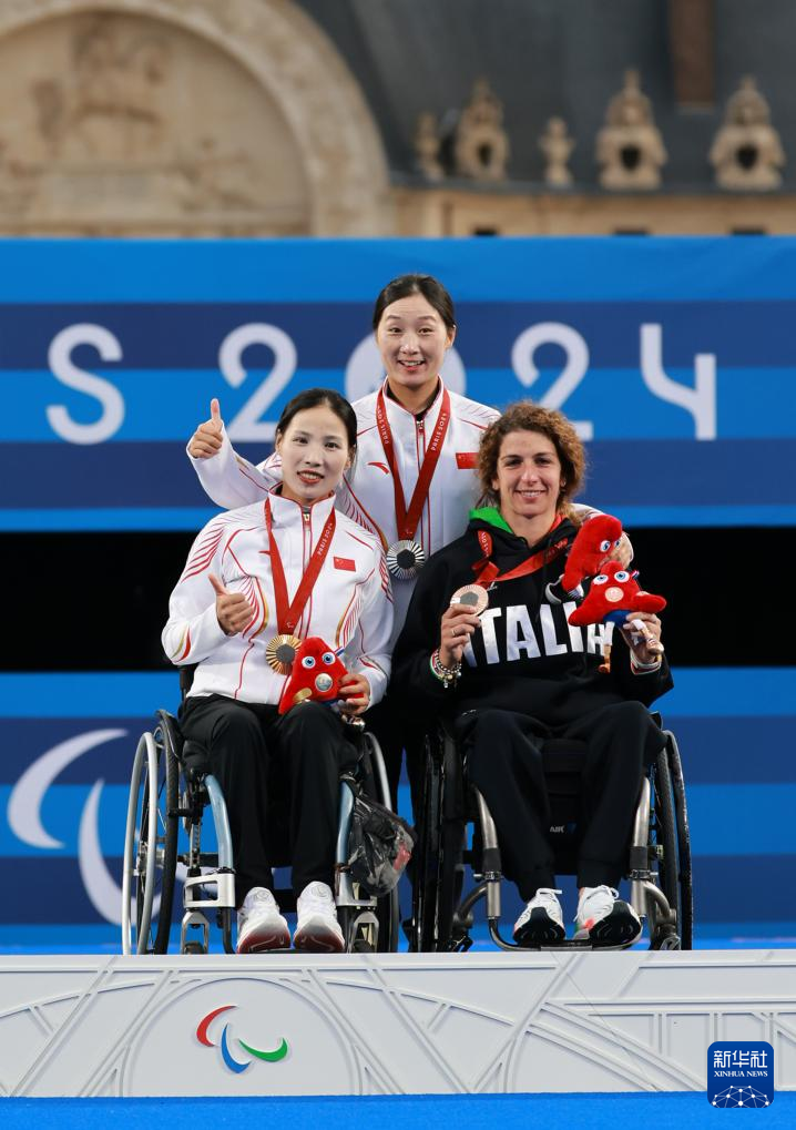 9月3日,冠军中国选手吴春艳(中)、亚军中国选手毋洋(左)和季军意大利选手伊丽莎白·米诺在颁奖仪式上。