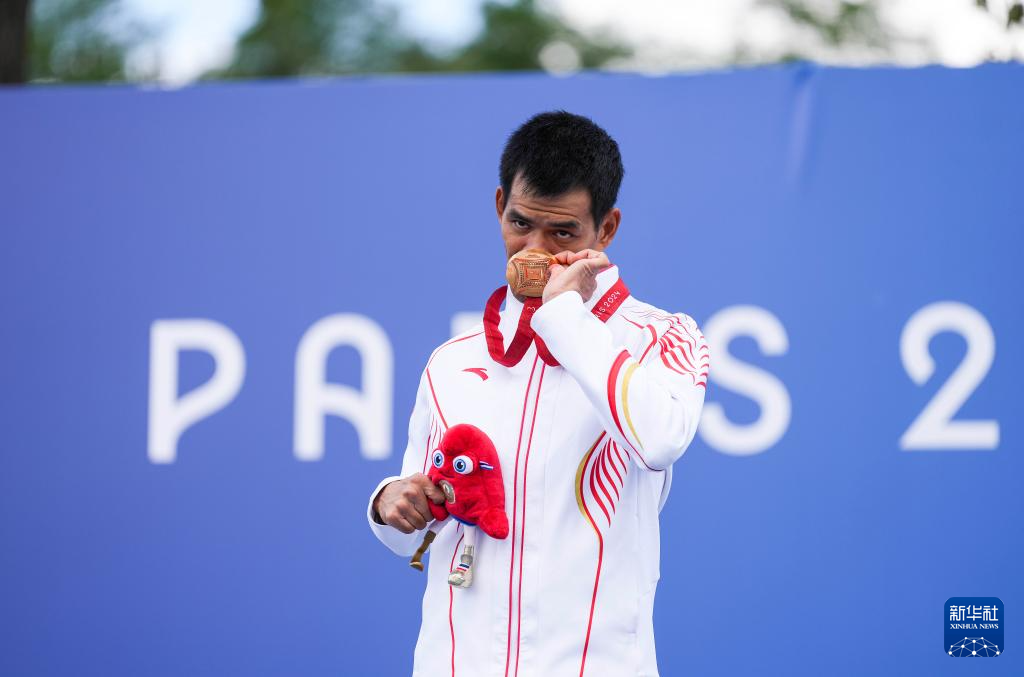 9月4日,陈健新在颁奖仪式上亲吻金牌。新华社记者 张豪夫 摄