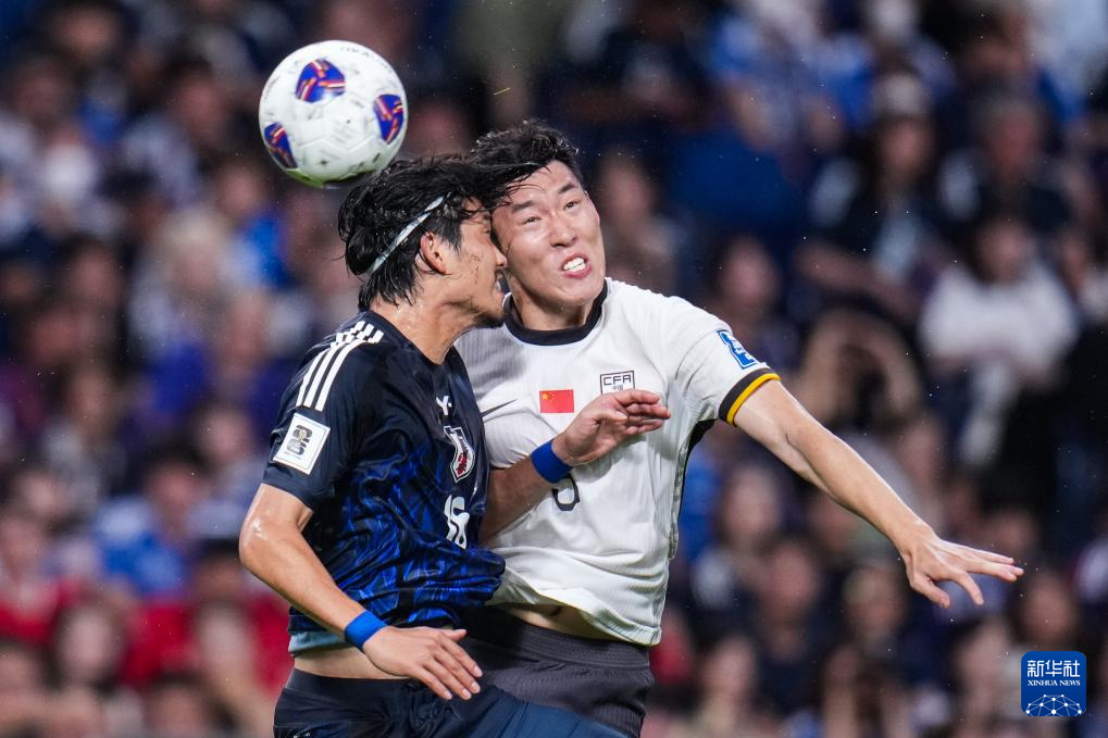 9月5日,中国队球员朱辰杰(右)和日本队球员町田浩树在比赛中争顶。新华社记者 张笑宇 摄