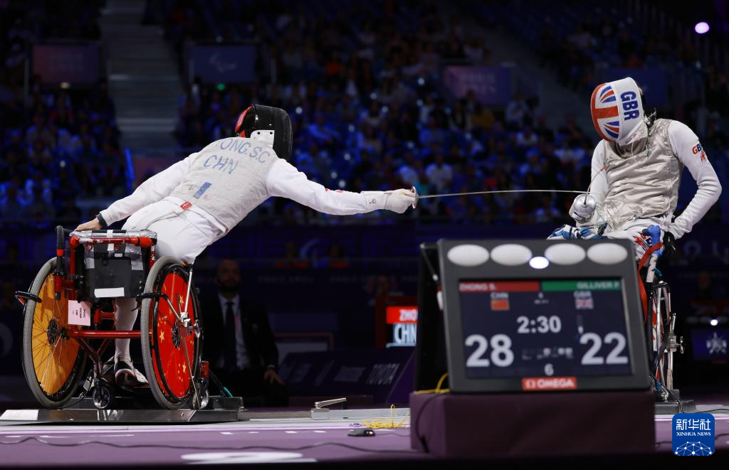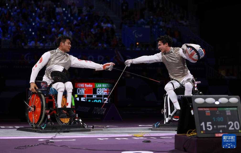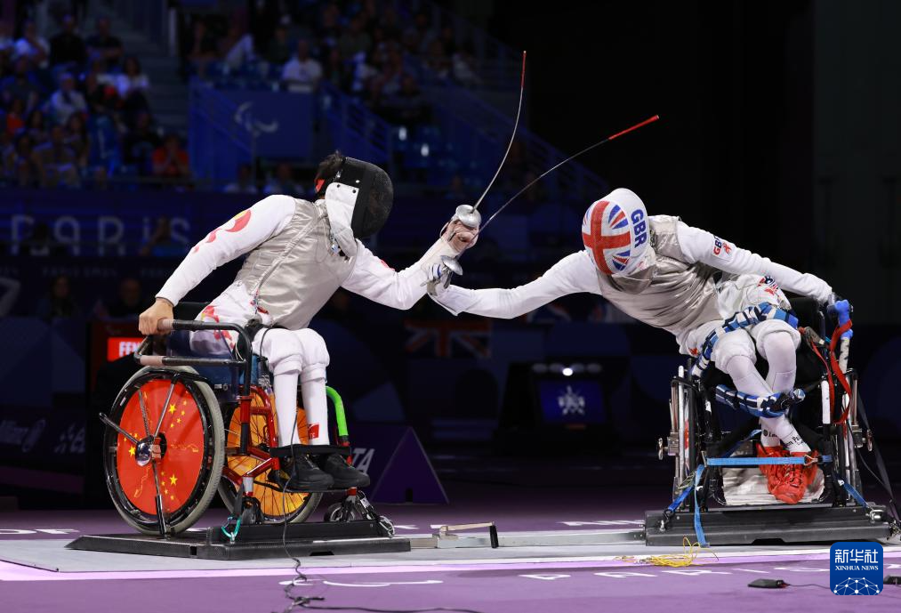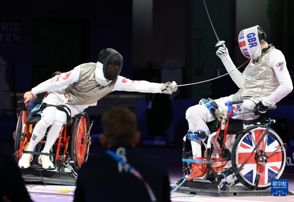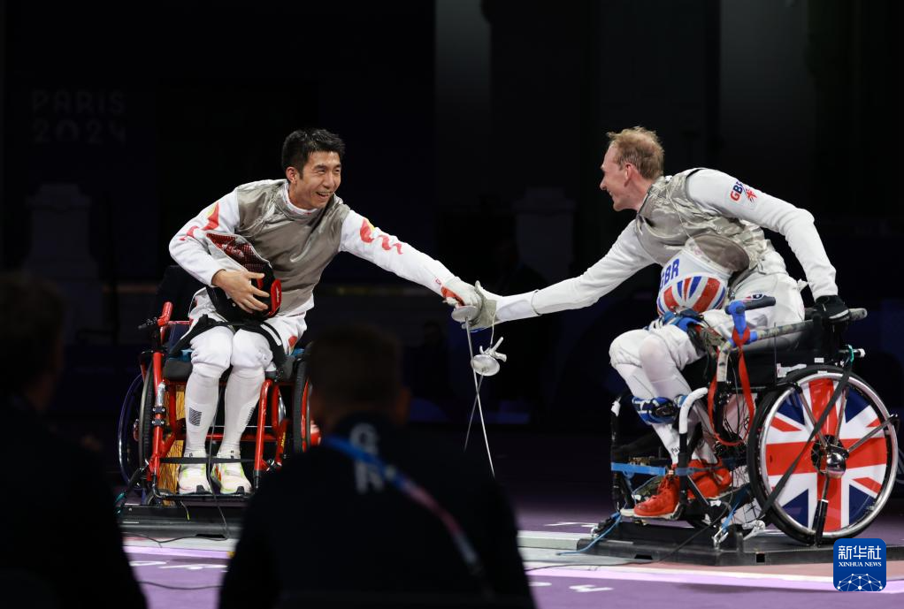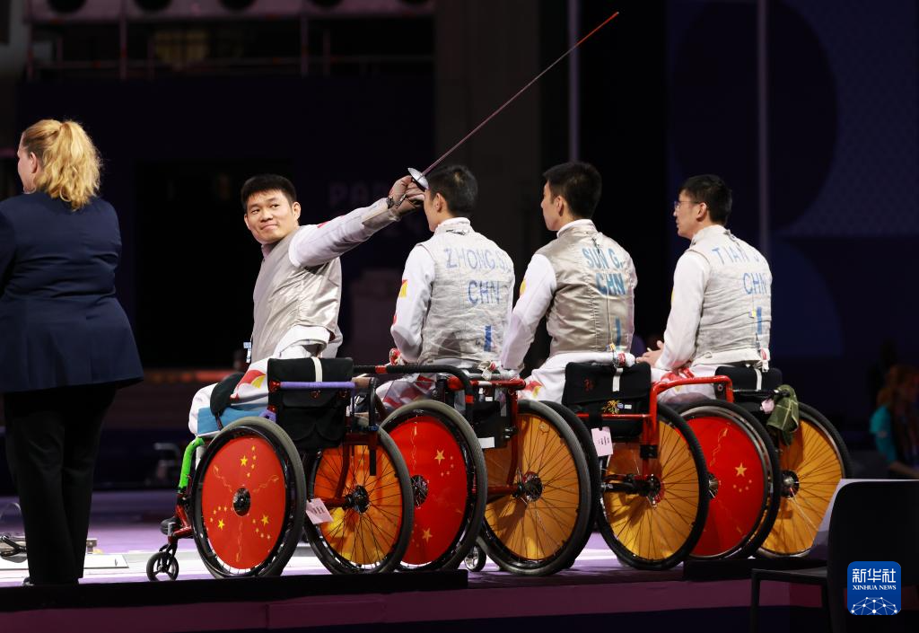当日,在巴黎残奥会男子花剑团体赛决赛中,中国队45比34战胜英国队,获得冠军。
