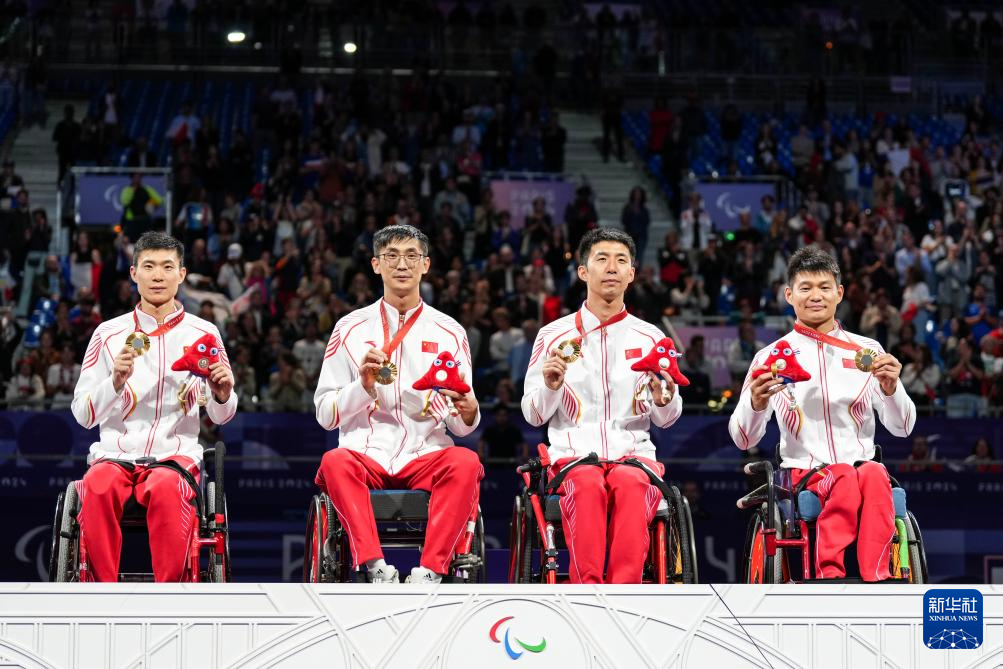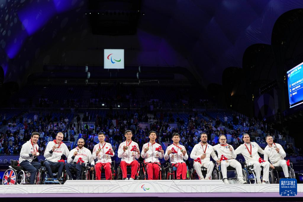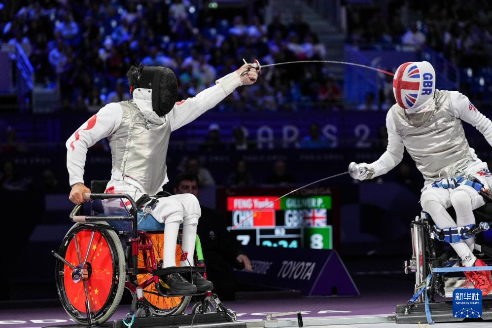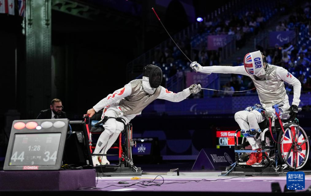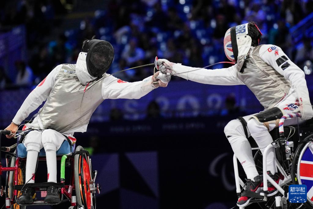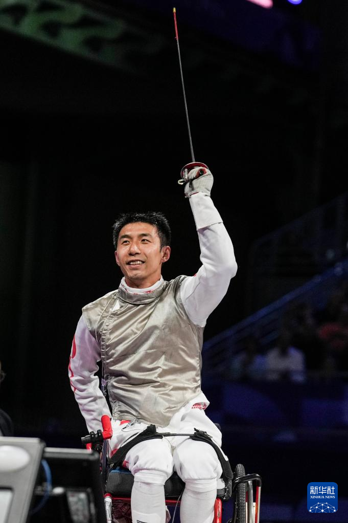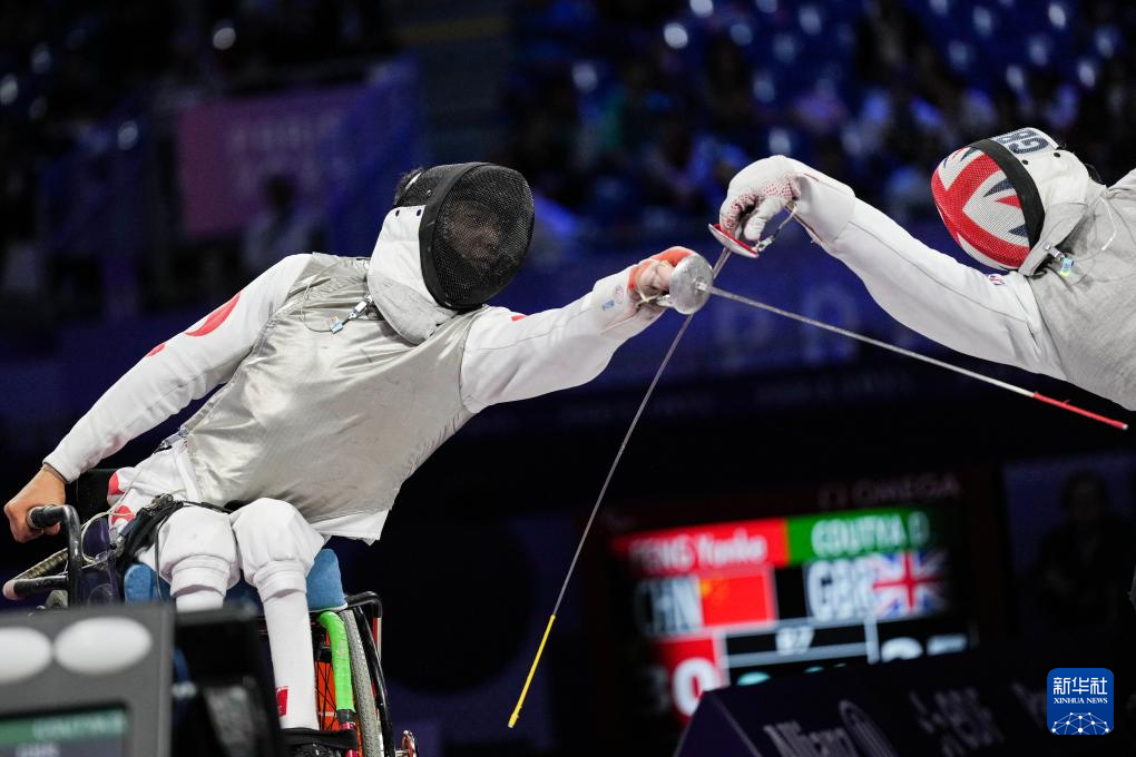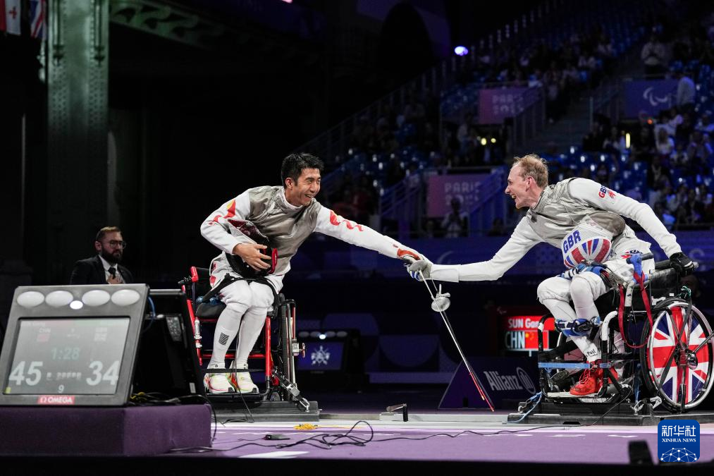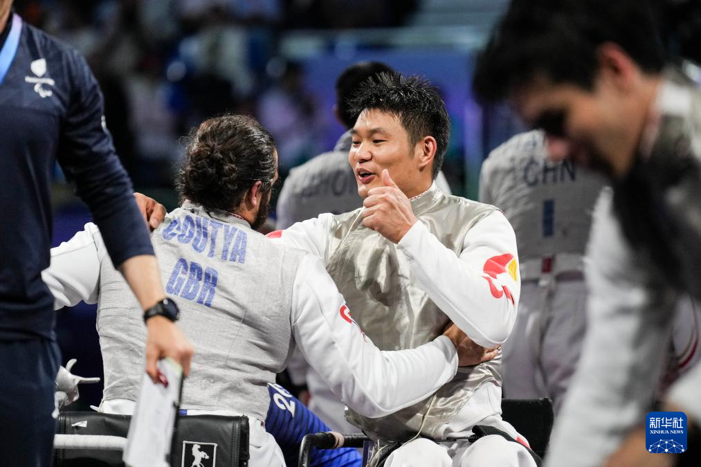 当日,在巴黎残奥会男子花剑团体赛决赛中,中国队45比34战胜英国队,获得冠军。