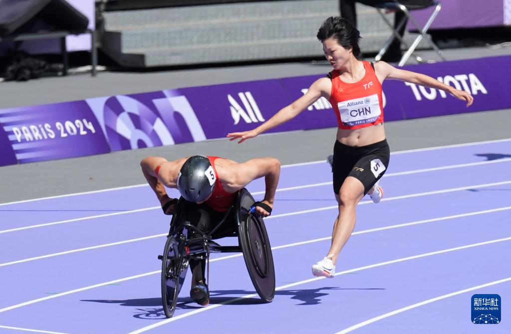9月6日,中国队第一棒选手周国华(左)与领跑员贾登璞在预赛中。新华社记者 才扬 摄