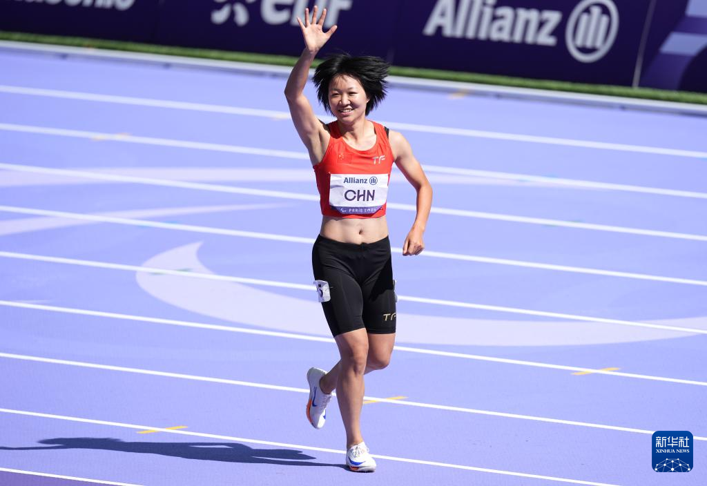 9月6日,中国队第三棒选手文晓燕在预赛后庆祝。新华社记者 才扬 摄