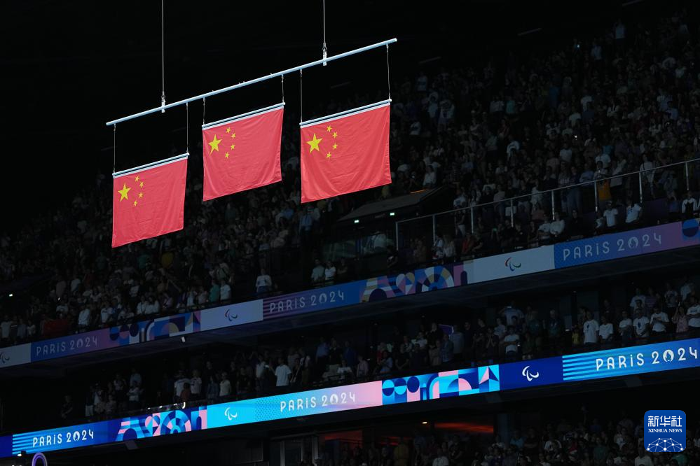 9月6日,男子50米蝶泳S5级颁奖仪式上升起三面五星红旗。
