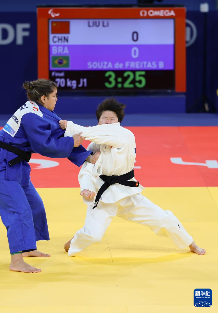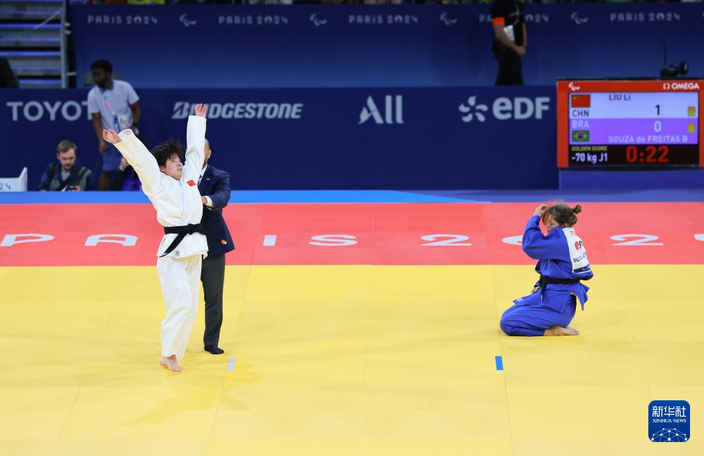 当日,在巴黎残奥会盲人柔道女子70公斤J1级决赛中,中国选手刘立1比0战胜巴西选手德弗雷塔斯,获得金牌。