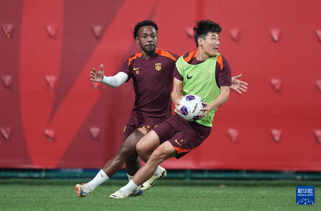 9月7日,中国队球员费南多(左)和武磊在训练中。
