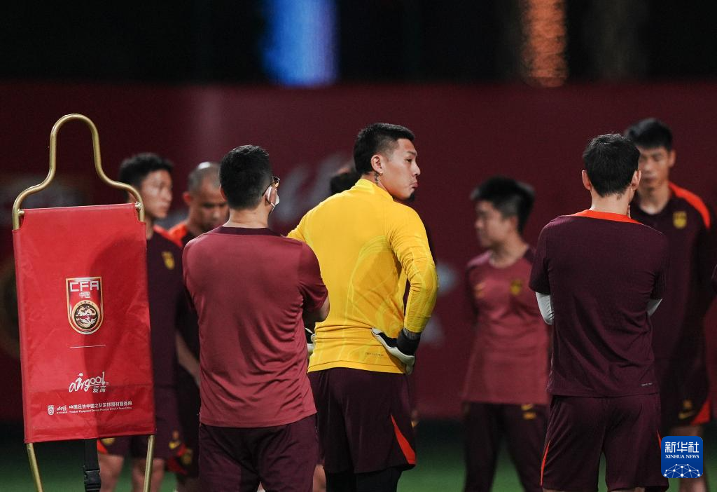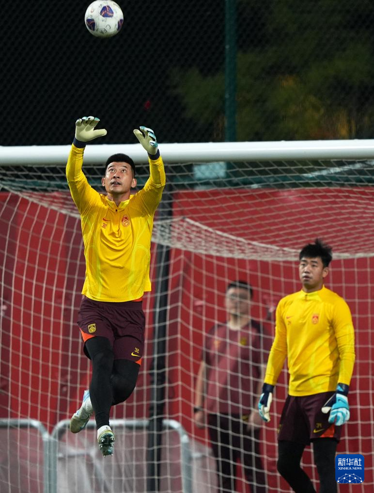 9月7日,中国队守门员刘殿座(左)和鲍亚雄在训练中。