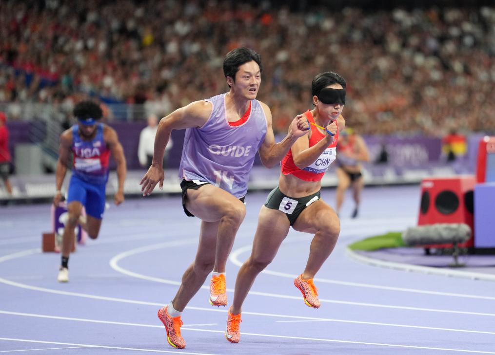 由于周国华是T11级盲人选手,因此她比赛时身边总少不了引导员贾登璞的身影,今年已是他们搭档的第十年。从23岁到33岁,这十年里,周国华从青涩走向成熟,贾登璞始终是她最信任的人。他们的脚步一起穿过经纬线,跨越高山湖海。周国华感慨地说,他们是队友、是搭档,更是家人。“很庆幸,我们今天又在一起经历了人生中一个重要的幸福时刻。”