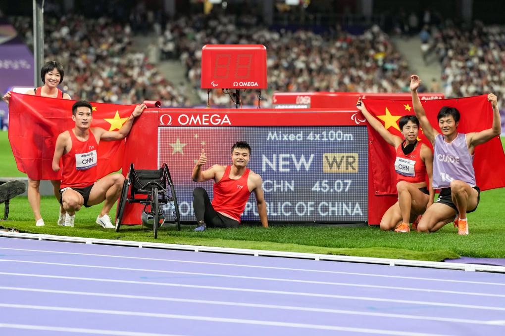 伴随着法兰西体育场数万人山呼海啸般的呐喊,胡洋一骑绝尘,45秒07!中国队如愿获得了这块巴黎残奥会田径赛场上含金量极高的金牌,并刷新世界纪录。
