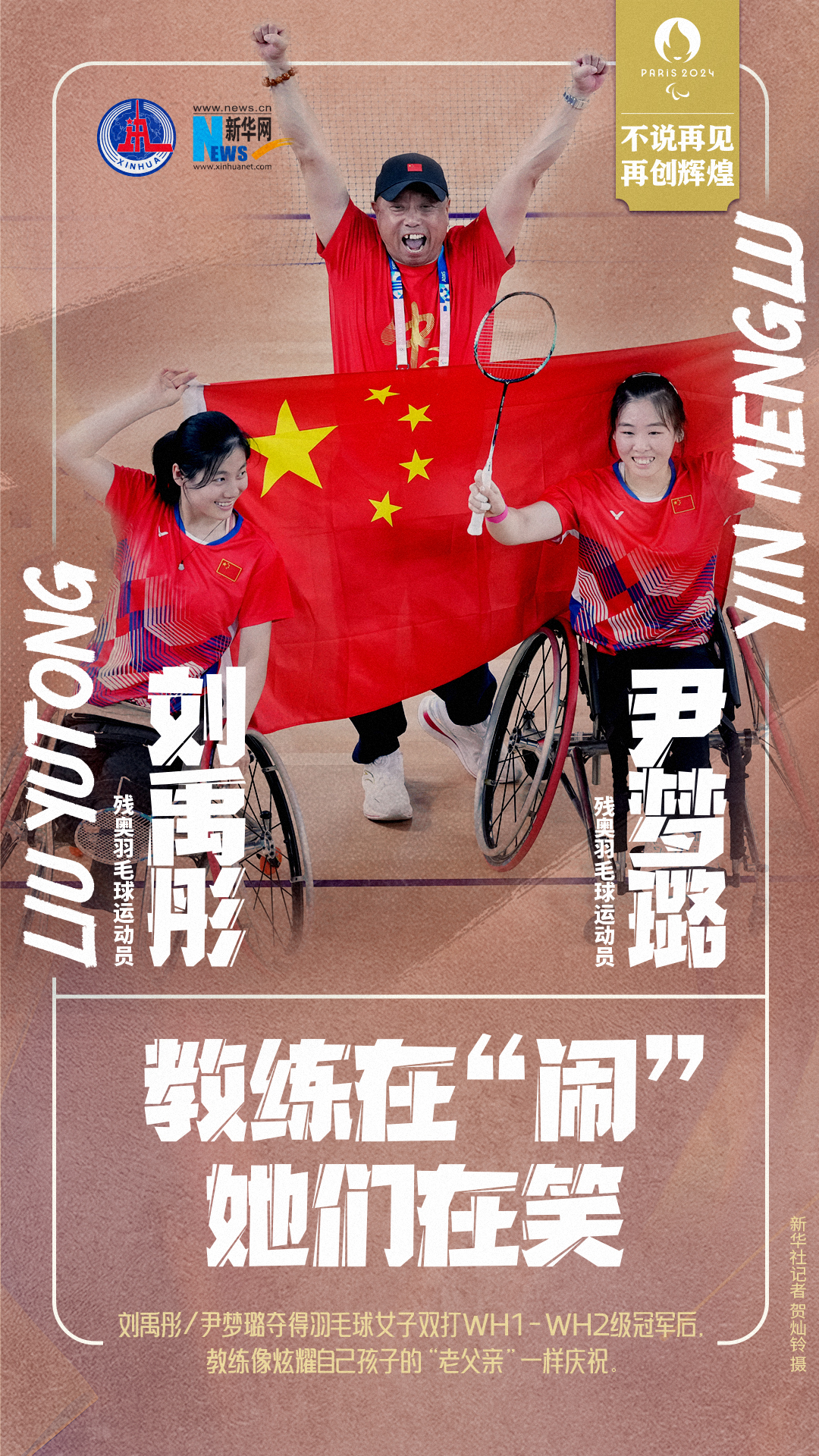 巴黎残奥会羽毛球女子双打WH1-WH2级决赛,中国组合刘禹彤/尹梦璐以2:0战胜日本组合。赛后,教练像炫耀自己孩子的“老父亲”一样推着两人转圈,开心呐喊。