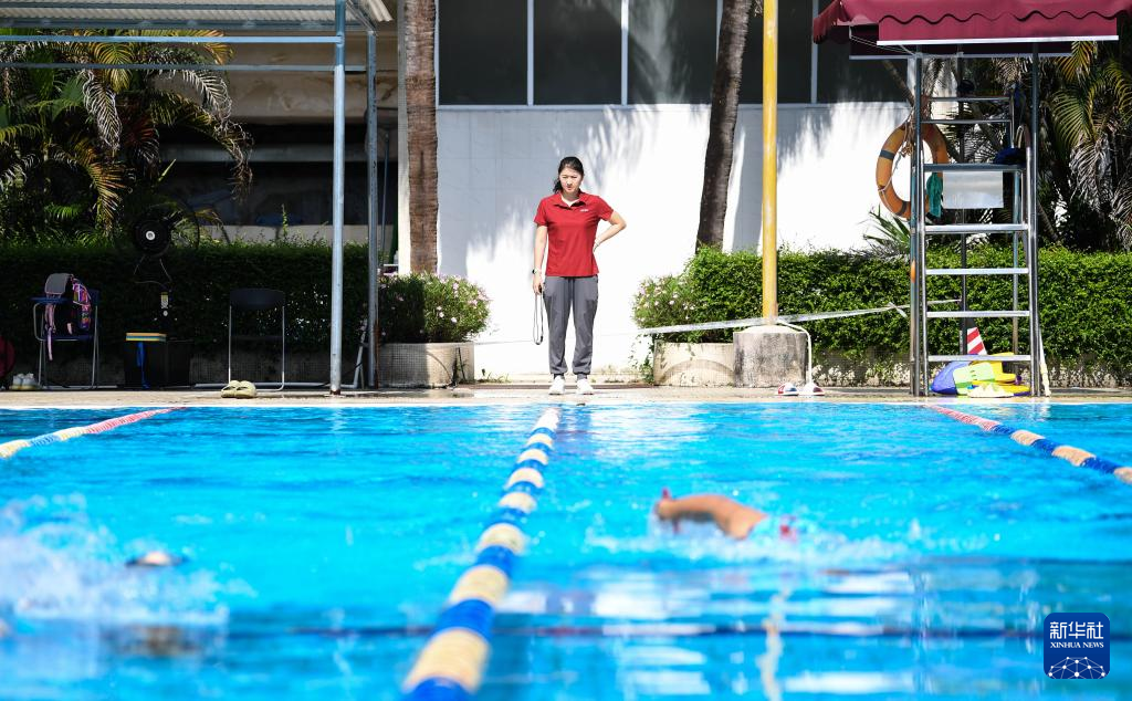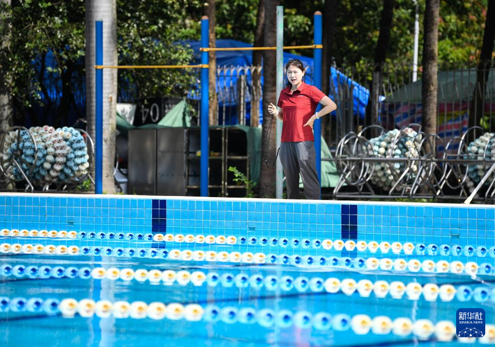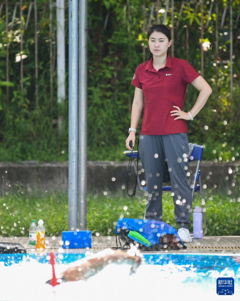 焦刘洋在中山大学游泳馆指导学校高水平游泳队队员训练(2024年9月5日摄)。新华社记者 邓华 摄