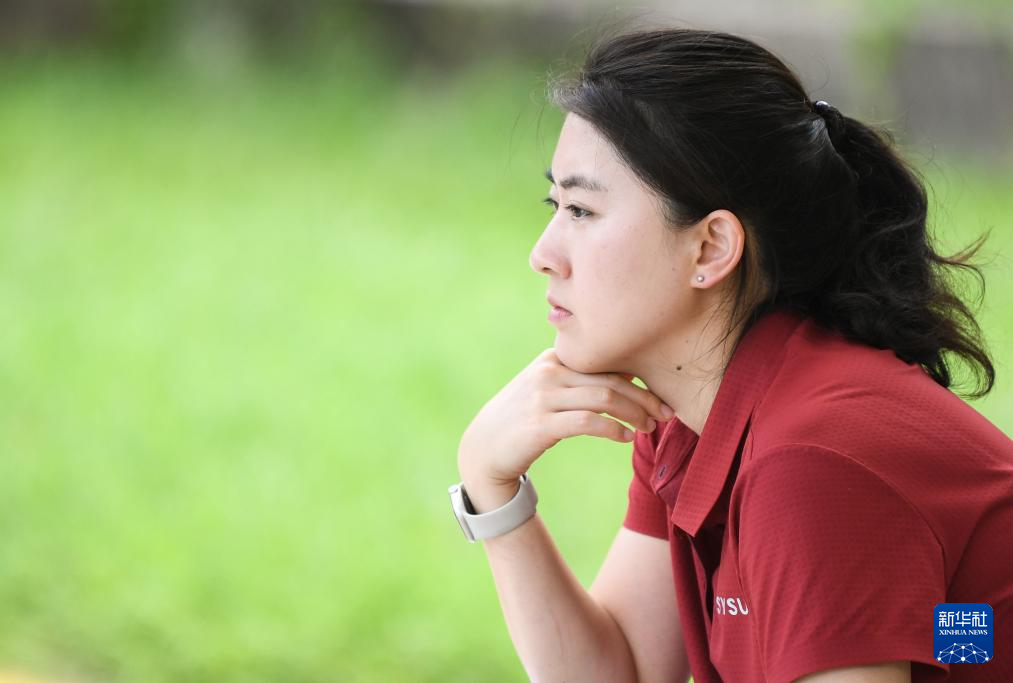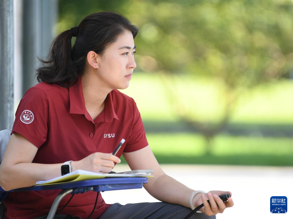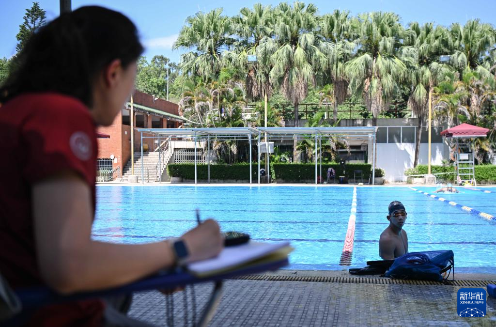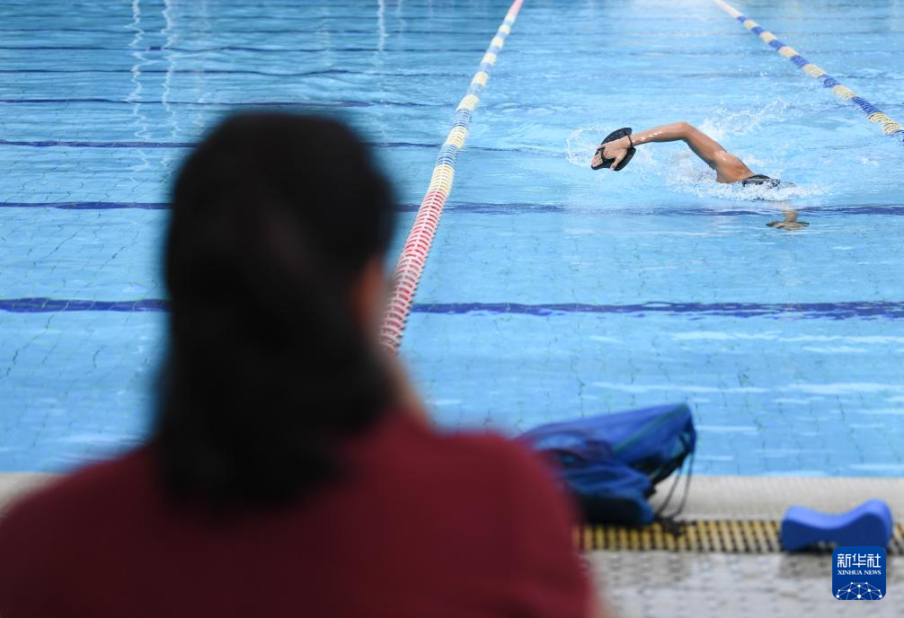 焦刘洋在中山大学游泳馆观看学校高水平游泳队队员训练(2024年9月5日摄)。新华社记者 邓华 摄
