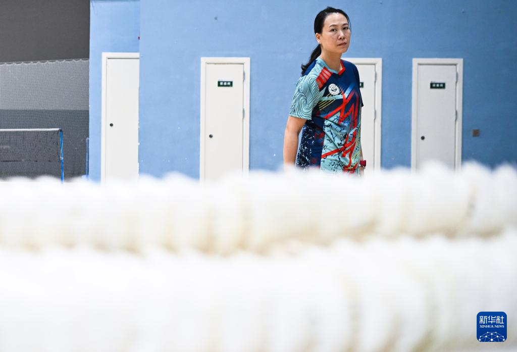 张洁雯在中山大学体育馆羽毛球场指导学校羽毛球队队员训练(2024年9月5日摄)。新华社记者 邓华 摄