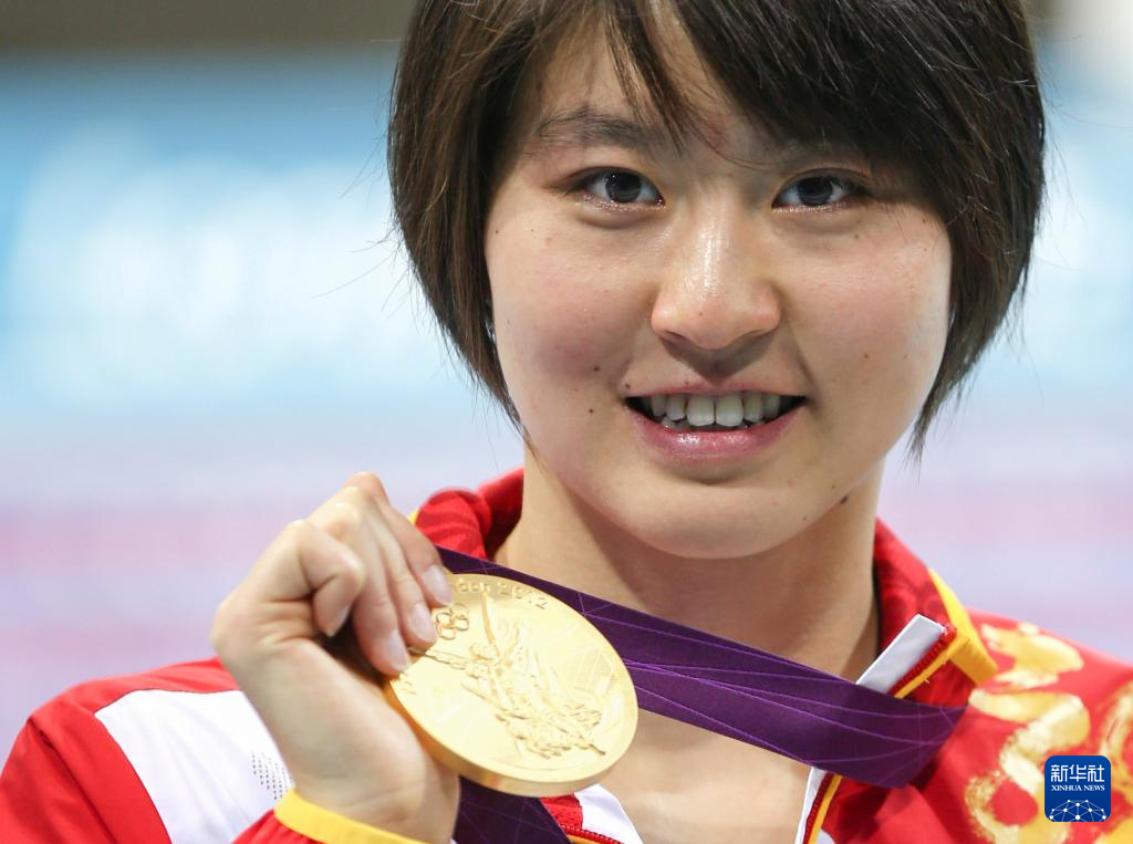 冠军焦刘洋在伦敦奥运会游泳女子200米蝶泳颁奖仪式后展示金牌(2012年8月1日摄)。新华社记者 费茂华 摄