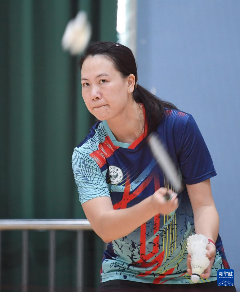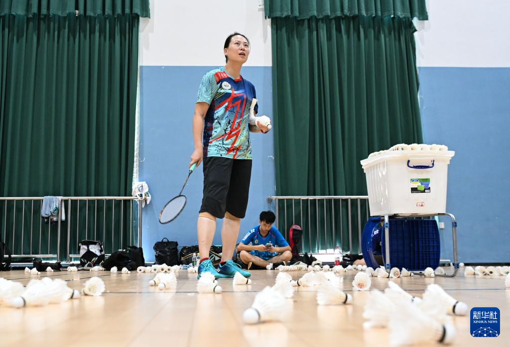 张洁雯(左)在中山大学体育馆羽毛球场指导学校羽毛球队队员训练(2024年9月5日摄)。新华社记者 邓华 摄