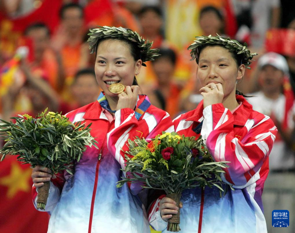 冠军中国组合杨维/张洁雯(左)在雅典奥运会羽毛球女子双打颁奖仪式上(2004年8月21日摄)。新华社记者 罗更前 摄