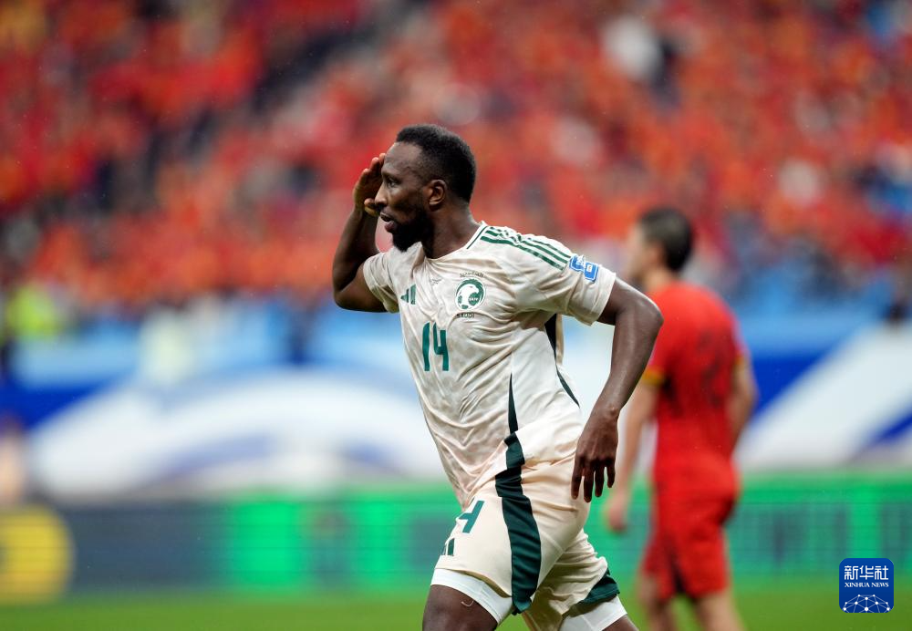 9月10日,沙特队球员卡代什(右三)在比赛最后时刻破门得分。