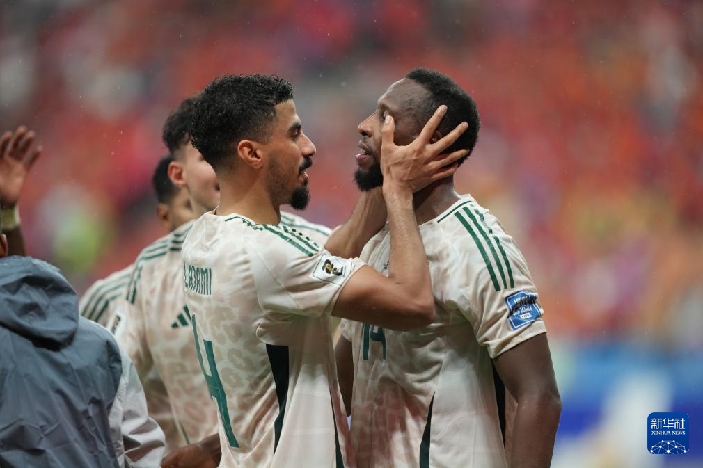 9月10日,沙特队球员卡代什(右)进球后与队友庆祝。