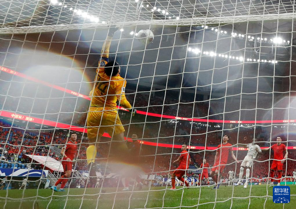 9月10日,中国队守门员王大雷(中)在比赛最后时刻未能扑出沙特队球员卡代什的射门。