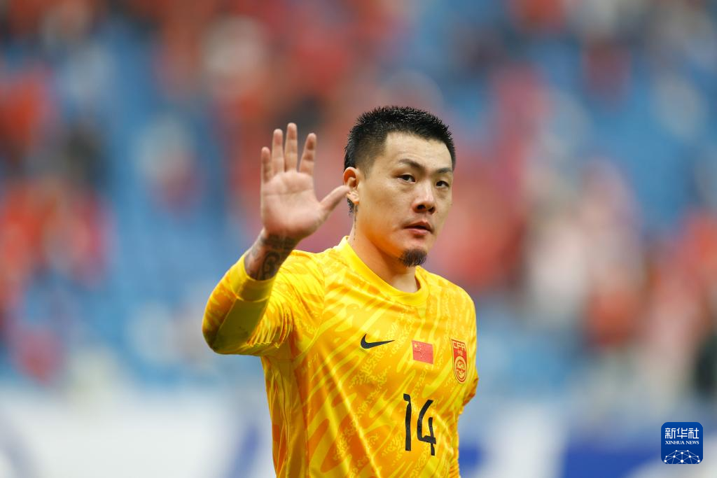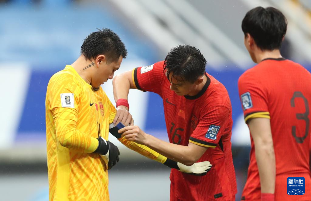 9月10日,中国球员蒋圣龙(中)为队守门员王大雷(左)戴队长袖标。