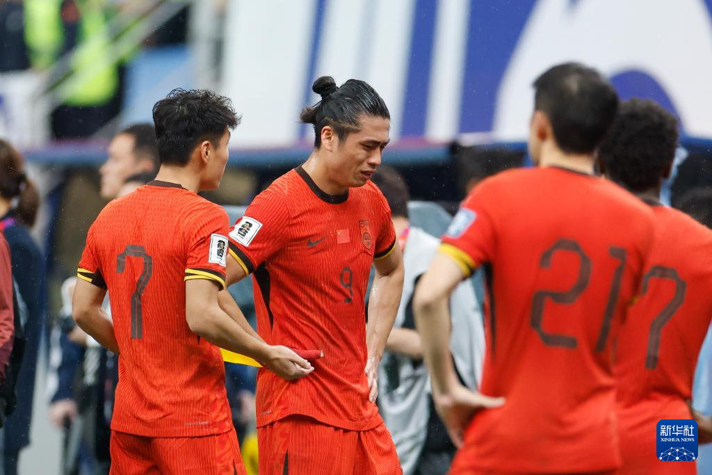 9月10日,中国队球员张玉宁(左二)在比赛后落泪。
